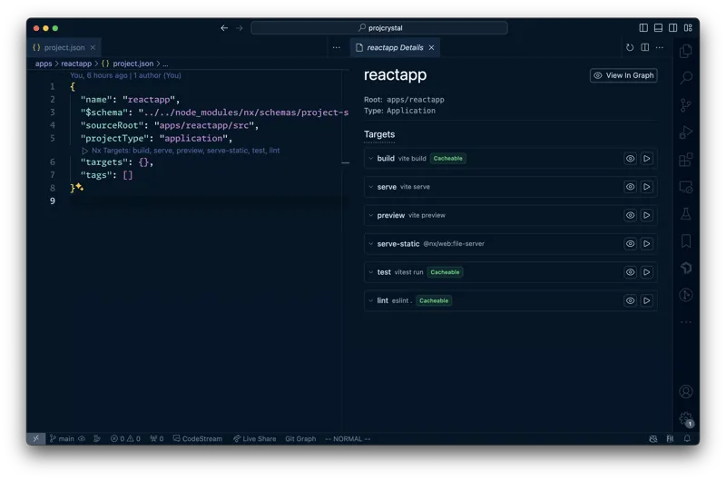 ... and you choose an "integrated monorepo" you'll get the usual setup powered by Nx Plugins and all the features and benefits that come with them. Where you'll see Project Crystal in action is when you open a project.json file, which will most likely look like the following:
